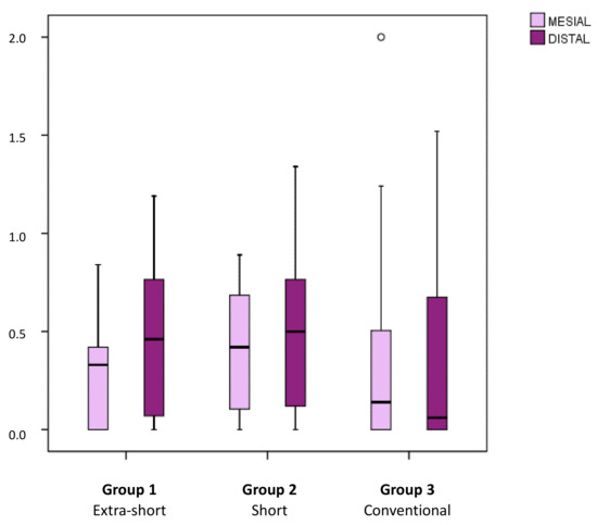 Figure 6. Box plots represent mean marginal bone loss of extra-short, short, and conventional length implants in relation to interproximal area (mesial/distal). Atypical values are represented by circles.
