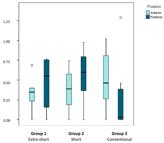 Figure 7. Box plot represents marginal bone loss in relation to implant position (anterior or posterior) for extra-short, short, and conventional dental implants. The horizontal line in each box represents the median value.
