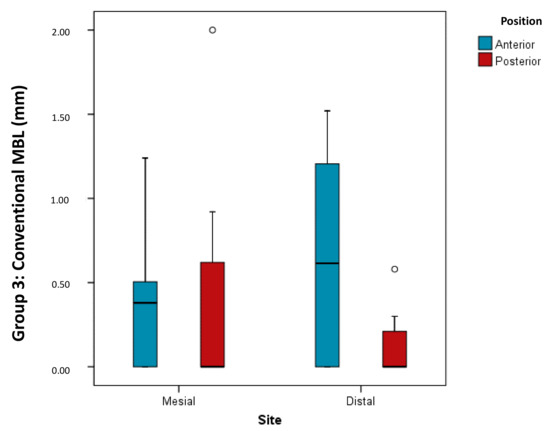 Figure 8. Box plot shows comparison of distribution of bone loss according to implant position and interproximal area analyzed within the group of conventional length implants.