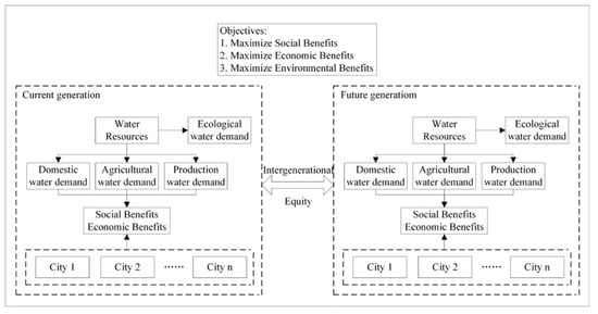 With the continuous growth of population, the environment is rapidly being destroyed, people have higher demand for water resources, and the international community pays more attention to intergenerational equity, which poses a new challenge to the existing water resources management strategy. To achieve sustainable development, protect the rights and interests of future generations of water resources and realize intergenerational equity, it is necessary to create a new water resources allocation model. One of the methods to solve the problem of water resource management is multi-objective optimization [32]. This paper constructs a water resource allocation model that includes efficiency, equity, and sustainable development, with a focus on promoting intergenerational equity. The flow chart of the proposed method is shown in Figure 1.