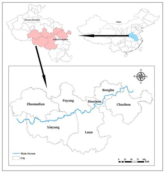 As shown in Figure 2, the Huaihe River Basin is located at 112°–121° E and 31°–36° N. It is located between the Yellow River Basin and the Yangtze River Basin, with a drainage area of 270,000 km2. It includes the four provinces of Henan, Anhui, Jiangsu, and Shandong, and is an important food and manufacturing base in China. However, the middle and upper reaches of the Huaihe River Basin have a large population and belong to the high population density area. The level of economic development and urbanization is less advanced in China. According to the water resources bulletin of the Huaihe River area, the average precipitation in the middle and upper reaches of the Huaihe River Basin is 700 mm. The precipitation time is mainly concentrated in June to September, and the space is mainly concentrated in the lower reaches of the Huaihe River Basin. The precipitation presents uneven spatial and temporal distribution. Due to the severe water shortage area, the per capita water resources are less than 500 m3. In recent years, the water resources in the upper and middle reaches of the Huaihe River Basin have been supplemented by the Yangtze River Basin [33,34,35].