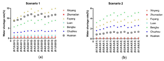 Water shortage rate of different subareas with different sets of objective weights ((a) 2020, (b) 2050, (0.7 0.2 0.1) means , , ).