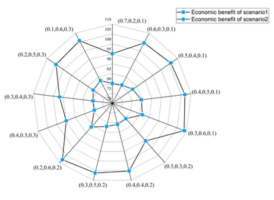 Economic benefits with different sets of objective weights ((0.7, 0.2, 0.1) means , , ).
