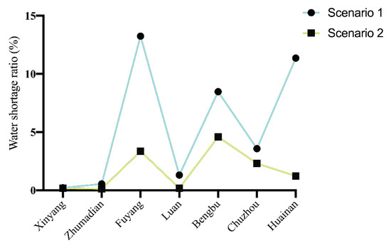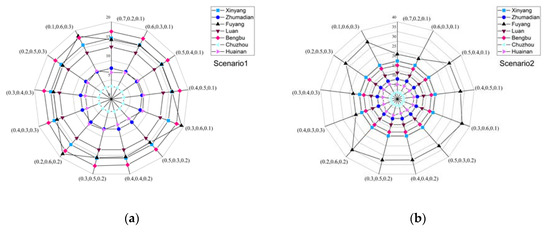Figure 4 shows the water shortage ratio of the seven cities in the middle and upper reaches of Huaihe River Basin under different generations and with different weights in the objective function. This allows the evaluation of the sensitivity of the seven cities in relation to the objective function. As shown in Figure 4, under the same weight, the water shortage ratio of all the cities of the future generation has decreased to a certain extent compared with that of the current generation. The water shortage ratio of Xinyang, Zhumadian and Lu’an changes little with the changing weight of the objective function, and the water shortage ratio is within 1%. It can be concluded that these three cities are not short of water, so they are not sensitive to the objective function. However, in the contemporary generation, the water shortage rate of Fuyang, Bengbu, Chuzhou and Huainan has changed greatly, as much as 6% in Fuyang. In the future, the water shortage rate of Fuyang, Bengbu and Chuzhou will still change greatly. These cities are all in the middle reaches of the Huaihe River Basin. This shows that the water resources conflicts that area are fierce.