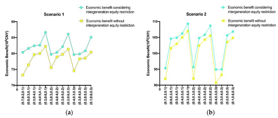 Comparison of economic benefits that do and do not consider intergeneration equity restriction ((a) 2020, (b) 2050, (0.7 0.2 0.1) means , , ).
