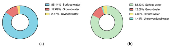 Water supply ratio of each water source in Huaihe in (a) 2020, (b) 2050.