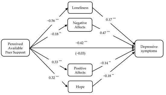 The direct effect (standardized coefficients) of each path. Note: ** p < 0.01, and *** p < 0.001. Direct effect of perceived available peer support on depressive symptoms after introduced mediators was presented in parenthesis. Gender and age were entered as covariates (not presented in the figure).