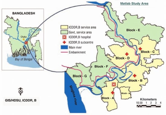 Since 1966, the Health and Demographic Surveillance System (HDSS) has been operating in a rural area of Bangladesh named Matlab. As per Figure 1, the Matlab HDSS area was divided into two parts in 1987: the icddr,b service area (ISA: administrative blocks A, B, C, and D), and the government service area (GSA: administrative blocks E, F, and G), covering 142 villages. HDSS has been pulling together vital statistics (live births, still births, miscarriages, deaths, marriages, and in and out migration) through community health research workers (CHRWs) since 1966 [25]. The CHRWs accumulate vital demographic data by visiting each household on a bi-monthly basis. At each visit CHRWs complete vital event registration forms. The details are described elsewhere [26,27].