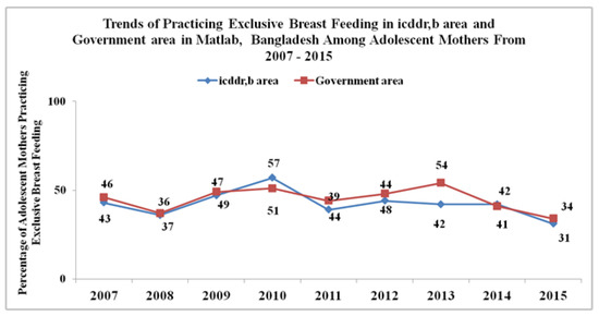 Trends of practicing exclusive breastfeeding (EBF) in the International Centre for Diarrheal Disease Research, Bangladesh (icddr,b) area and the government service area in rural Matlab, Bangladesh, among adolescent mothers from 2007 to 2015.
