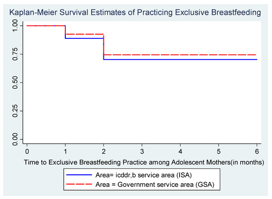 Bivariate findings in Table 2 demonstrated that there were a total of 824 cases of adolescent mothers who discontinued EBF from both the ISA and GSA. Only the government service area and paternal education were found to have a significant relation with the practice of EBF among adolescent mothers (p < 0.05); 29.6% of adolescent mothers in the ISA discontinued EBF of their children, whereas in the GSA, 25.6% of adolescent mothers did the same. Less than 30% of children also had experience with the discontinuation of EBF. The distribution of categories of other covariates was found to be non-significant with the discontinuation of EBF as per bivariate findings (Table 2). The event of discontinuing EBF among adolescent mothers was measured by adjusting the effect of area (government service area or icddr,b area), maternal education, paternal education, asset score, religion, delivery place, mode of delivery, number of antenatal care (ANC) visits, adolescent mothers’ age at birth, sex of children, and repeated pregnancy during the study period. These covariates were selected based on their significant relationship with discontinuation of EBF (from bivariate analysis findings and literature review). The incidence of discontinuing EBF was lower for an adolescent mother residing in the government service area (AHR: 0.85, 95% CI: 0.72–0.99) compared to an adolescent mother residing in the icddr,b area, keeping all the other variables at a fixed level (Table 2). This result was different from the findings from Kaplan–Meier survival estimates (Figure 3), where adolescent mothers of the GSA had significantly higher possibilities of discontinuing EBF compared to those of the ISA. Adolescent mothers with no education (AHR = 1.02, 95% CI: 0.63–1.66) or primary education (AHR = 1.03, 95% CI: 0.85–1.24) were found to be more likely to stop EBF compared to highly educated adolescents for this study (this findings was not significant). Cox proportional hazards regression analysis also revealed no gender differences to being exclusively breastfed (AHR: 1.00, 95% CI: 0.88, 1.15). Adolescent mothers from families of higher socio-economic status (AHR: 0.84; 95% CI: 0.67, 1.07) had a lower risk of early cessation of EBF compared to adolescent mothers from lower socio-economic status. Similarly, adolescent mothers who had 4+ ANC visits (AHR = 1.03, 95% CI: 0.84–1.25) were more prone to stopping EBF relative to who had less than 4 ANC visits, but this findings was not significant. Adolescents who had delivered their babies at home (AHR = 0.98, 95% CI: 0.82–1.17) were less likely to stop EBF compared to those who went to health facilities for delivery of their baby. Findings also stated that adolescent mothers who delivered their babies through C-section were less likely to stop EBF compared to those who had a normal delivery.