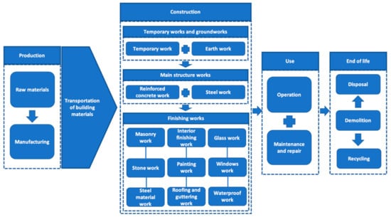 The construction industry is regarded as one of the main contributors to environmental damage since it consumes a large volume of energy and emits various pollutants [1,2,3]. This industry accounts for about 40% of global energy consumption and approximately 35% of total greenhouse gas emissions [4,5,6]. In particular, the life cycle of a building spans over a period of more than 50 years, which is much longer than the lifespans of other products or services [7,8,9]. Due to the long life cycles of buildings, the majority of studies regarding energy consumption and reducing the environmental impacts of buildings have almost exclusively focused on energy consumption during the operation and maintenance phase while ignoring other stages in the life cycles of buildings [3,6,10,11]. Moreover, the operation and maintenance phase of a building uniquely consumes the majority of energy and greenhouse gas emissions. As a result, one of the main approaches to mitigate environmental impacts in the construction industry is to lower energy consumption in the operation and maintenance stage [10,11,12]. Operating energy consists of the energy used for heating, cooling, ventilation, appliances, and other auxiliary systems by the occupants of a building. One of the most prevalent approaches to lowering the operating energy is the zero-energy building concept, which maximizes the efficiency of energy consumption during the operation and maintenance of a building [10,13,14]. As the energy consumption and environmental impacts during the operation and maintenance phases decrease with the application of newly developed technologies, the environmental impacts that occur during the pre-operational stages, such as the manufacturing of materials, transportation, and construction, increase gradually as a proportion of the whole.