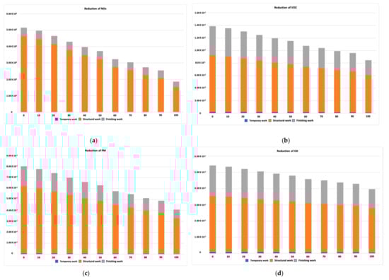 In this section, we investigate how road transport pollutant emissions will change when the old vehicles are replaced by new ones registered after 2003, when the regulations on pollutant emissions for vehicles were tightened. The changes in pollutant emissions were examined for a case where 10% of old vehicles were replaced by new vehicles. The changes in road pollutant emissions were considered according to the type of construction work and the building material.