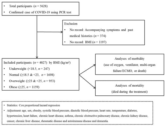 It has been suggested that obesity is a risk factor for severe COVID-19 [10,11,12]. Among < 50-year-old COVID-19 patients in the US, a body mass index (BMI) ≥ 40 kg/m2 was associated with a 5.1-fold higher mortality rate (95% CI = 2.3–11.1) [11]. Another retrospective study in the US demonstrated 3.78-fold higher in-hospital mortality rate among COVID-19 patients with BMI values ≥ 35 kg/m2 [12]. Reduced cardiorespiratory reserve and immune dysregulation were proposed as plausible mechanisms for the increased mortality due to COVID-19 in these severely obese patients [10]. Many studies have investigated severely obese patients [13]. However, the risk of mortality in patients with severe COVID-19 who are overweight or less severely obese is unclear [14,15]. Although obese patients have a higher rate of developing severe COVID-19 than nonobese patients, overweight patients did not have the same increased risk (odds ratio [OR] = 1.84, 95% CI = 0.99–3.43, p = 0.05) [14]. Another retrospective cohort study reported that the risk of severe COVID-19 was not significantly elevated in overweight and obese patients (BMI = 30–34.9), but was significantly elevated in severely obese patients (BMI ≥ 35) (OR = 5.39, 95% CI = 1.13–25.65, p = 0.034) [15]. In addition, the obesity paradox was proposed based on the decreased mortality due to acute respiratory distress syndrome (ARDS)/acute lung injury in patients with obesity [16]. It was suggested that preconditioning by obesity, which is a chronic inflammatory condition, might limit the adverse impacts of more serious inflammatory responses [17]. In summary, the impact of overweight and obesity on the severity of COVID-19 is unclear. Moreover, few studies have evaluated the association of underweight with the severity of COVID-19.