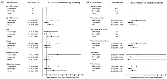 Subgroup analyses to obtain the adjusted hazard ratios (95% confidence interval) for mortality according to age, sex and hypertension (a) and heart failure, chronic heart failure and asthma (b). (* p < 0.05).