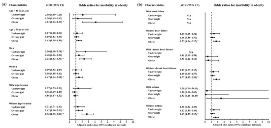 Subgroup analyses to obtain the adjusted odds ratios (95% confidence interval) for the maximum level of morbidity during hospitalization according to age, sex and hypertension (a) and heart failure, chronic heart disease and asthma (b). (* p < 0.05).