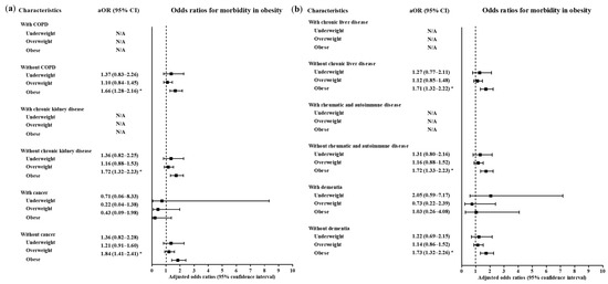 Subgroup analyses to obtain the adjusted odds ratios (95% confidence interval) for the maximum level of morbidity during hospitalization according to chronic obstructive pulmonary disease, chronic kidney disease and cancer (a) chronic liver disease, rheumatic and autoimmune disease and dementia (b). (* p < 0.05).