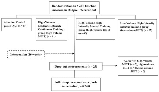 After baseline measurements, EXERDIET-HTA participants were randomly allocated into one of the four intervention subgroups stratified by sex, systolic BP, BMI, and age using a time-blocked computerized randomization program. The medical staff was blinded to participant randomization assignment. The four intervention subgroups were: three supervised ExT groups (i.e., high-volume MICT, high-volume HIIT, low-volume HIIT) on two non-consecutive days per week under supervision by exercise specialists for 16 weeks; and one attention AC, with only physical activity advice participating in at least 30 min of moderate-intensity aerobic exercise (walking, jogging, cycling, or swimming) for 5–7 days per week blended with some dynamic resistance exercises []. The high-volume MICT group performed 45 min of aerobic continuous exercise at moderate intensity, whereas the high- and low-volume HIIT groups performed 45 and 20 min, respectively. In the HIIT groups, they alternated high- and moderate-intensities performing protocols previously published []. All participants underwent a hypocaloric DASH diet. The diet was designed to provide 25% less energy than their daily energy expenditure and to achieve a weekly loss in body mass of between 0.5 and 1.0 kg in accordance with the recommendations of the American Diabetes Association and the Spanish Society for the Study of Obesity []. The diet contained approximately 30% fat, 15% protein, and 55% carbohydrates and was designed following the DASH diet. To ensure participant compliance with the DASH diet every two weeks participants were weighed and received encouragement and advice alongside nutritional counseling to aid compliance [].