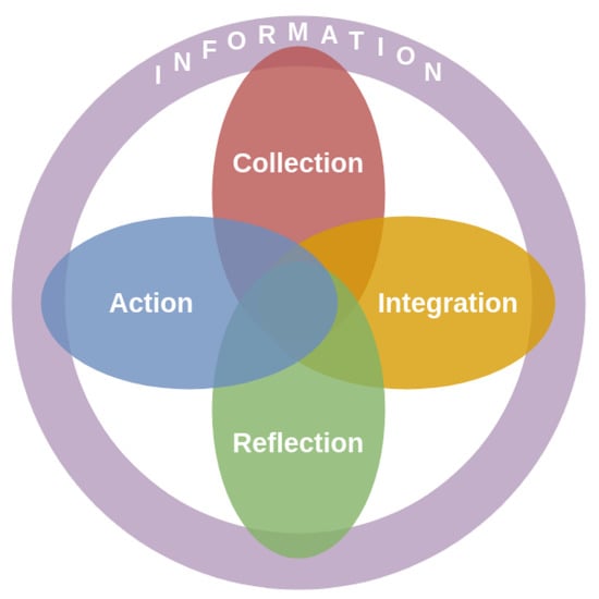 From their analysis of past literature and existing models, Vizer and colleagues have noticed a strong need for a model that more closely aligns to the unique needs of health context [,,]. In the light of these observations, they propose a new model which bridges the gap between current personal informatics models and tracking for chronic illness self-management. This new conceptual model of shared health informatics (CoMSHI) is based on Li’s model, but adds communication to incorporate interactions between actors and redefines preparation to information (see Figure 3).