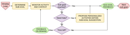 To support a user in increasing his/her physical activity level, we articulate our model around three different time scales: a weekly time scale as a basis for user profile (corresponding to the learning phase which has been described in Section 4.2), a daily time scale used to set optimal objectives based on the previously determined user profile, and an intraday time scale (e.g., hourly) necessary to monitor user progress toward daily objective and to help him/her if necessary [,]. This aims to maintain a sufficient motivation to achieve an unusual level of physical activity while avoiding disengagement.