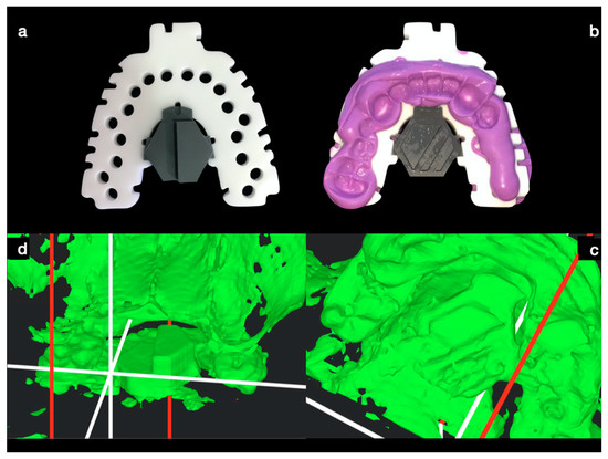 The fiducial marker device (NaviBite®, Biomax Spa, Italy) is helpful to align the STL files of the soft tissues and teeth with their own representation on DICOM files (a) and is customized using a silicon index material on both sides (b). A radiopaque marker is embedded in the center part of the device to be used, on both sides, for the STL-DICOM merging step, as shown in the 3D views (c,d).