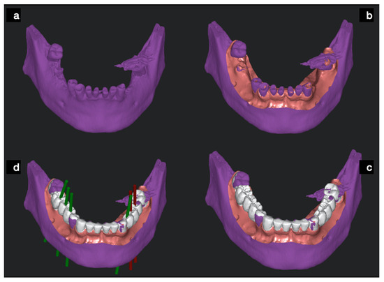 The pre-op planning and post-op CBCT of the model overlapped to analyze implant deviations. A preliminary segmentation of both implants and jaws was performed (a–d). The 3D objects of the jaws were hidden, leaving only 3D implants of both the pre-op and post-op scan (c). These implant positions and images were used to perform the deviation analysis.