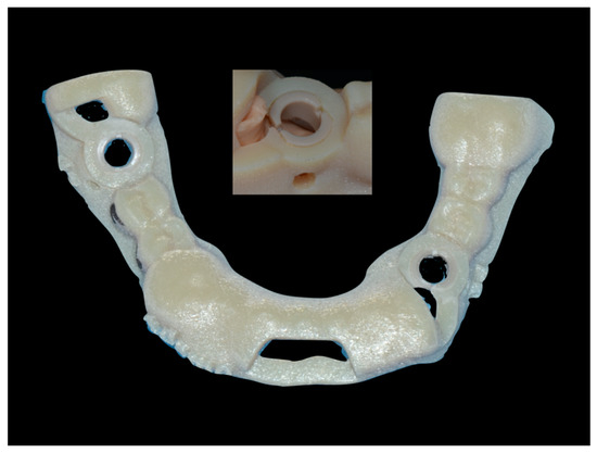 The stereolithographic surgical guide with PEEK sleeve embedded. It is important to note sleeves placed in the sites where SCAI protocol was planned and the wax-up shape of the guide for the remaining implant site.