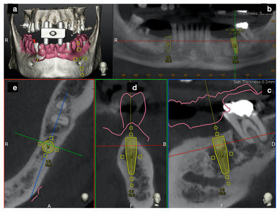 The Navident desktop was divided into five windows. The 3D view shows the fiducial marker used and the overlapped STL file taken from an extra oral scan of the lower jaw (a). Four 2D windows (panorex (b), sagittal (c), cross-sectional (d), and axial (e)) allowed us to perform the implant planning. After wax-up, the STL file was overlapped above the original patient’s DICOM data, and a prosthetic driven implant planning was performed.
