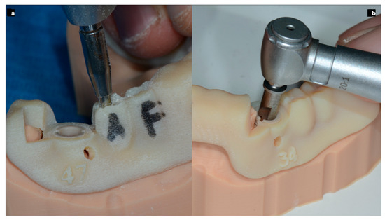 To perform the free hand (template guided) surgeries in the most accurate manner, the guides were perforated in the center of the occlusal plate of each selected site (a) and an attempt to be compliant with the project was done. Picture (b) shows a site with a sleeve and a dedicated bur performing the static SCAI approach.