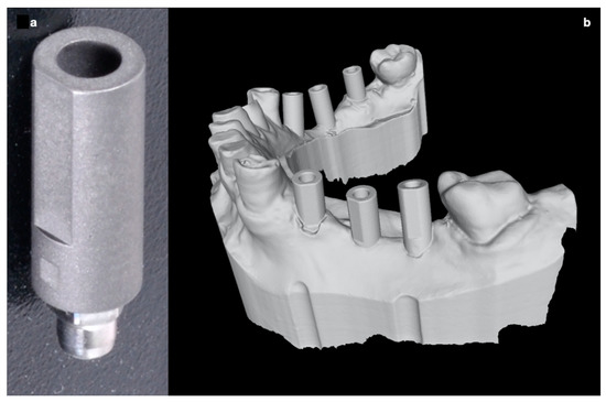 The position of the achieved implants was carried out by scanning the original scan abutment (a) for digital workflow (Biomax spa, Vicenza, VI, Italy). The picture (b) shows the resulting 3D digital cast obtained by the IOS of the resin model used to perform the surgeries.