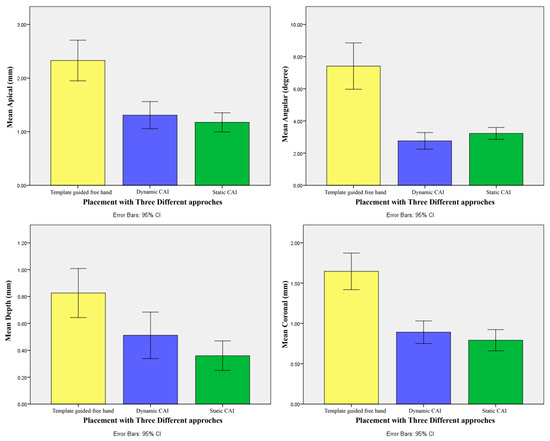 Simple bar charts (with confidence intervals) show the mean at coronal (mm), apex (mm), depth (mm), and angle (°) level among the three different approaches of implant placement.