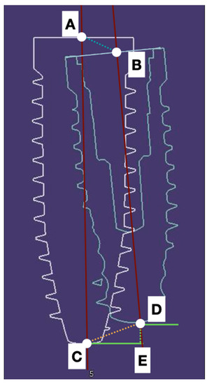 The reference points taken into account to assess deviations were the coronal (A,B) and the apical (C,D) deviation of the center part of the implant. The depth displacement (D,E) represented the final effect of the deviation on the final vertical position of the implant apex. The angular (AC,BD) deviations were also estimated.