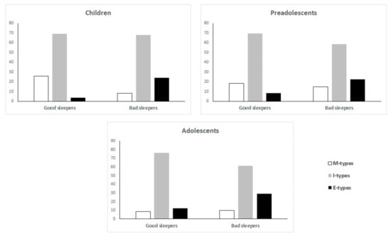 Frequency distribution of M-types, I-types and E-types differed between good and bad sleepers in children (χ2= 20.8, p < 0.001), preadolescents (χ2= 16.1, p = 0.002) and adolescents (χ2 = 11, p = 0.004), with bad sleepers more frequently displaying an evening preference compared with good sleepers (Figure 2).