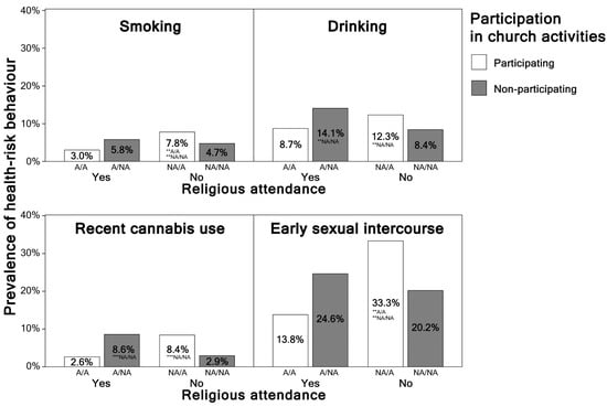 Prevalence of adolescent smoking, drinking, recent cannabis use, and early sexual intercourse in groups with different combinations of religious attendance and participation in church activities (Czech Republic, 2018). (Notes: ** p < 0.01, *** p < 0.001; A/A = attending/church activities; A/NA = attending/no church activities; NA/A = non-attending/church activities; NA/NA = non-attending/no church activities).