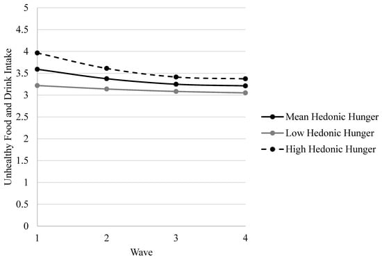 The linear wave × baseline hedonic hunger interaction showed that the association between baseline hedonic hunger and unhealthy food and drink intake weakened over time, and the quadratic wave × baseline hedonic hunger interaction showed that adolescents with high baseline hedonic hunger demonstrated a greater deceleration in this association. Yet greater baseline hedonic hunger was consistently associated with more unhealthy food and drink intake across the four years. Specifically, those high in hedonic hunger at baseline showed decreasing unhealthy intake that later stabilized over time, whereas those low in hedonic hunger at baseline showed relative stability in unhealthy intake across waves. Supplementary Tables S1–S3 showed that the primary results for baseline hedonic hunger and interactions between baseline hedonic hunger and the linear and quadratic components of wave were consistent across unhealthy food and drink subscales; only the significance of certain covariates differed across models.