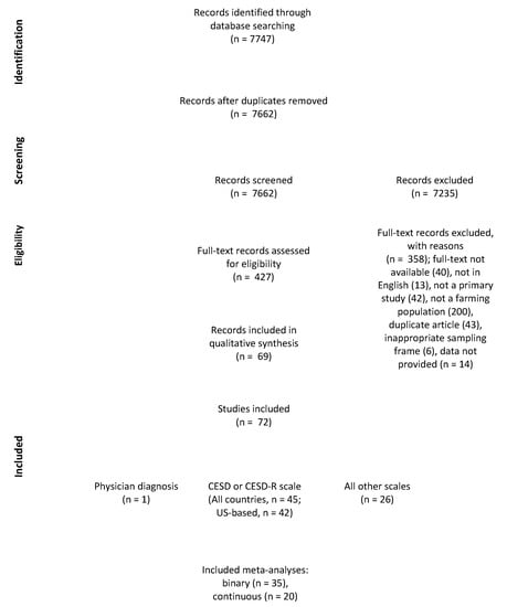 The selection of studies for inclusion in the systematic review is summarized in Figure 1. From 7662 initially identified records, 427 were assessed at full-text screening, with 69 records containing 72 studies ultimately deemed eligible for data extraction. Records excluded at this stage, including reasons for exclusions, are available as Supplemental File S1 (Material S1. Full-text exclusions). Six articles collected data on depression in a farming population, but as their primary objective was not to quantify depression, these were excluded to avoid additional bias. For example, one study sampled from a hospital population of farmers with COPD, where the prevalence of depression may not reflect that of the non-migrant farming population [13].