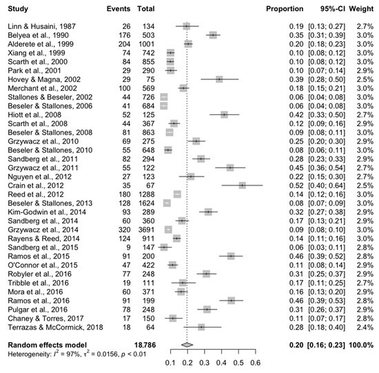 Results of the 35 studies reporting a binary outcome using the CES-D/DR scale included in the meta-analysis are summarized in Figure 2. The overall prevalence of depression was 20% (95% CI = 16–23%), with a large degree of heterogeneity (I2 = 0.97), indicating that the majority of between-study variation in the point estimate is likely due to factors other than sampling variation.