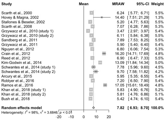Similarly, the subgroup analysis for studies reporting a continuous outcome (Figure 5) did not reduce the residual heterogeneity but did reveal point estimates between the population types that did not overlap. For studies evaluating a non-migrant farming population (n = 6), the mean scale score was 6.18 (95% CI = 5.52–6.85; I2 = 86%). For studies of migrant farmworkers (n = 14), the mean scale score was 8.68 (95% CI = 7.37–9.99; I2 = 98%).