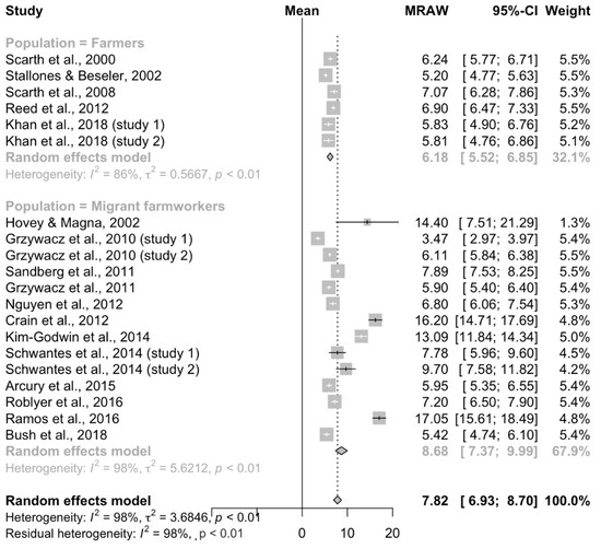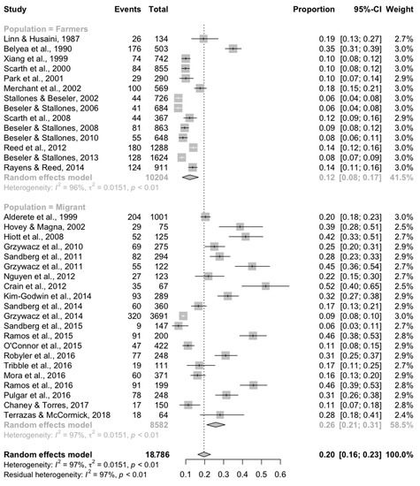Subgroup analyses were planned for population type (farmers, migrant-farmworkers, and permanent farm-workers) and type of validated scaled used, to further examine the potential heterogeneity.