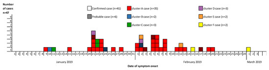 Measles cases according to day of symptom onset and cluster distribution, Austria, January–March 2019 (n = 47).