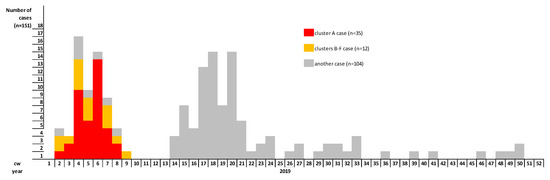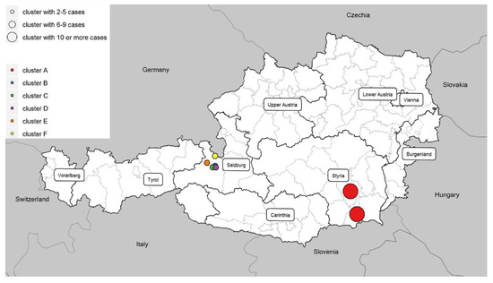 It was found that 47 cases (including 41 confirmed and 6 probable) of the total of 59 measles cases reported between 1 January and 11 March 2019 in Austria fulfilled the cluster case definition (Figure 1). Out of these 47 cases, 40 (85.1%) were unvaccinated. Out of the 43 vaccine-eligible cases, 36 were unvaccinated, four were vaccinated with two doses of MMR, and three were vaccinated with one dose of MMR. Out of 47 cases, 16 (34%) were healthcare associated, but were not healthcare workers. We identified clusters in two neighboring Austrian provinces: one in Styria (declared as cluster A) and five in Salzburg (declared as clusters B–F) (Figure 2), affecting communities with different attitudes towards vaccination. The remaining measles cases occurred as singletons (including imported cases) all over Austria.