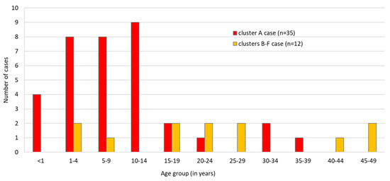 In Styria province, 35 identified cases belonged to cluster A, with one transmission chain with four case generations. The primary case, with rash onset on 9 January 2019, was an unvaccinated school pupil of 15 years of age with an anthroposophical family background and who consulted a pediatric clinic in Graz, Styria, during the contagious phase. In the same province, 34 successive cases occurred between 15 January and 20 February 2019 (Figure 1). Secondary (13 persons), tertiary and quaternary cases in the transmission chain occurred, but it was not possible to discriminate between third and fourth generation cases. The median age of the 35 cases was seven years (IQR: 1–11). Cluster A cases occurred most frequently in age groups 10–14 (n = 9), 1–4 (n = 8) and 5–9 (n = 8) (Figure 3).