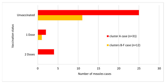 Of the 31 vaccine-eligible cases in cluster A, 25 (80.6%) were unvaccinated, four (12.9%) were vaccinated with two doses of MMR, and two (6.5%) were vaccinated with one dose of MMR. Four cases were infants younger than nine months of age who therefore were not yet eligible for MMR vaccines. Thirteen (52%) out of 25 unvaccinated patients were vaccine refusers (Figure 4 and Figure 5). Twenty-six out of 35 cases had Austrian nationality. The remaining cases had: Belarusian (n = 1), Croatian (n = 2), Romanian (n = 1), Serbian (n = 1), Slovenian (n = 1), Hungarian (n = 1) and American (n = 1) nationalities. In one case, nationality was unknown. Post-exposure prophylaxis was administered in four cases.