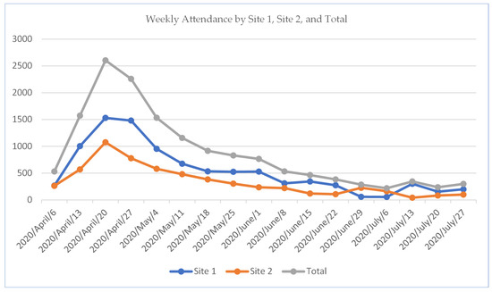 Monthly wellbeing centre attendance by site during April–July 2020.