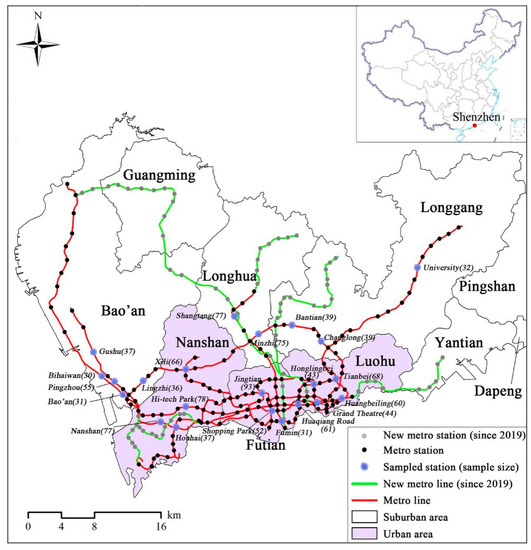 Study context of Shenzhen. Note: Since 2019, 70 new metro stations and 114.3 km metro lines have been built [37].