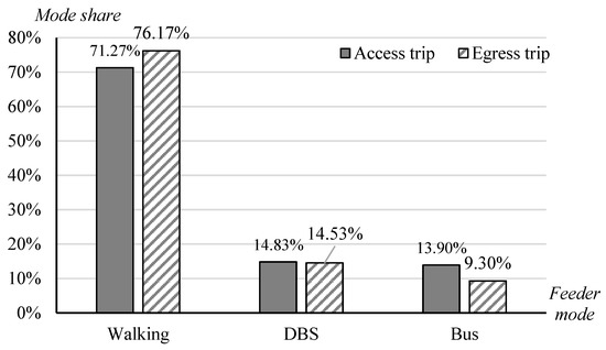 Table 2 reveals the feeder mode choice of men and women. It indicates that feeder mode choices substantially differ across genders. The male group has a similar share of walking with the female group but a higher share of DBS and a lower share of buses for access trips. As for egress trips, the differences in the share of three feeder modes between the two groups are subtle.