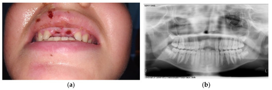 (a) Orofacial trauma with upper central incisors missing; (b) Panoramic X-ray confirming avulsion of teeth 11 and 21.