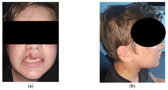(a) Orofacial trauma with upper lip laceration; (b) Extension of lesions on the cranio–cervico–mandibular complex.