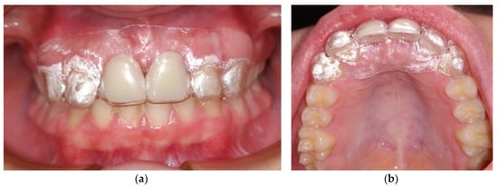 Trumpet edentulous anterior tooth appliance: (a) Front view; (b) Palatal view with the EVA material design and retention on the adjacent teeth.