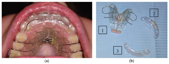 The customized splint placed over the Hawley appliance: (a) appliance in place; (b) The three intra-oral devices fabricated for this clinical case, the Hawley appliance with central expansion screw and two central incisors (1), the Trumpet edentulous anterior tooth appliance—TEATA (2), the customized splint (3).