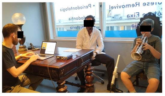 The design of this research was divided in two parts. The first part involves general considerations that should be taken into account within a dental appointment of a trumpet player with an orofacial trauma. The second part concerns the data collection of trumpet sound quality. Four recording sessions were conducted over ten months (10 September 2019; 14 October 2019; 3 February 2020; and 3 June 2020). The patient performance was recorded using the three intra-oral appliances conditions in all sessions, testing the effect of these devices on the trumpet sound quality during a musical performance (see Figure 6). Due to the patient’s limited pitch range without excessive effort, we consider the C major arpeggio (C, E, and G) in the octave 3 to be representative of different register conditions.
